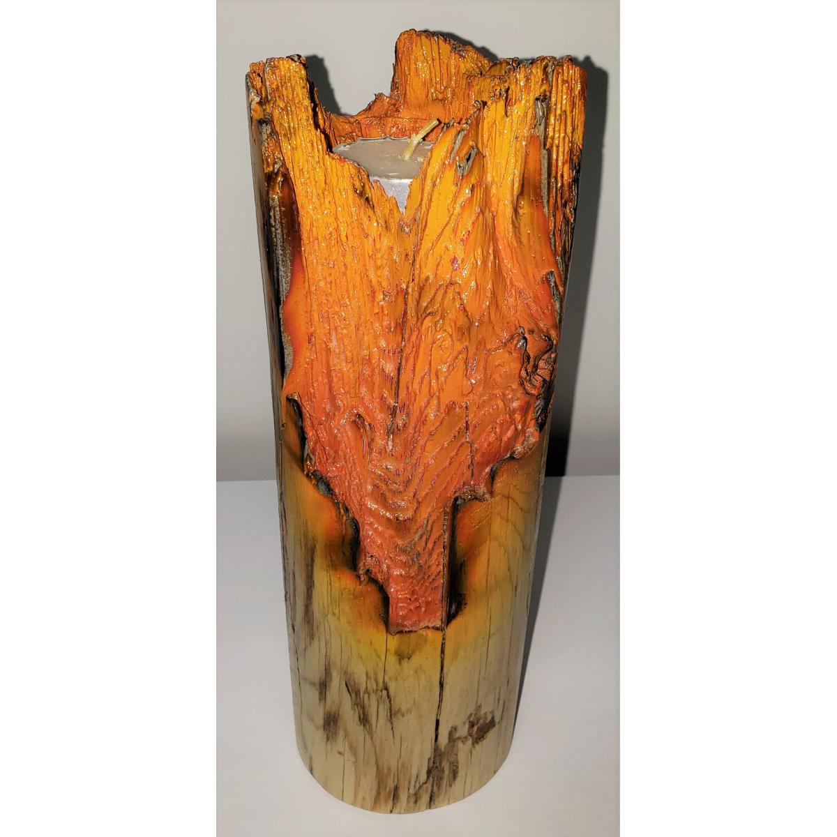 Tea Candle Holder made from Cedar. Looks like it's aflame and burned.